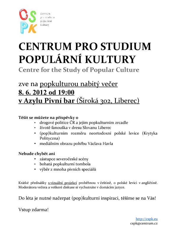 Centrum populární kultury je svými výjezdními večírky již proslulé. Po cestách do centra jižní Moravy, Hané, západních a východních Čech a Slovenska, se 8. června 2012 dočkali jeho návštěvy i na severu, v historickém centru českých Němců, Reichenbergu, dnes díky úspěšnému mistrovství světa v lyžování známém jako město Liberec. Ke konání akce byl vybrán klub Pivní bar Azyl, který již svým názvem dobře vystihuje českou národní vlastnost, jakou v každém případě nadměrné užívání pivního moku je. Do punkové vizáže oblečený klub společně s národním nápojem tak dodal punc čtyřem příspěvkům otevírajícím možné směry popkulturní reflexe středoevropské společnosti.